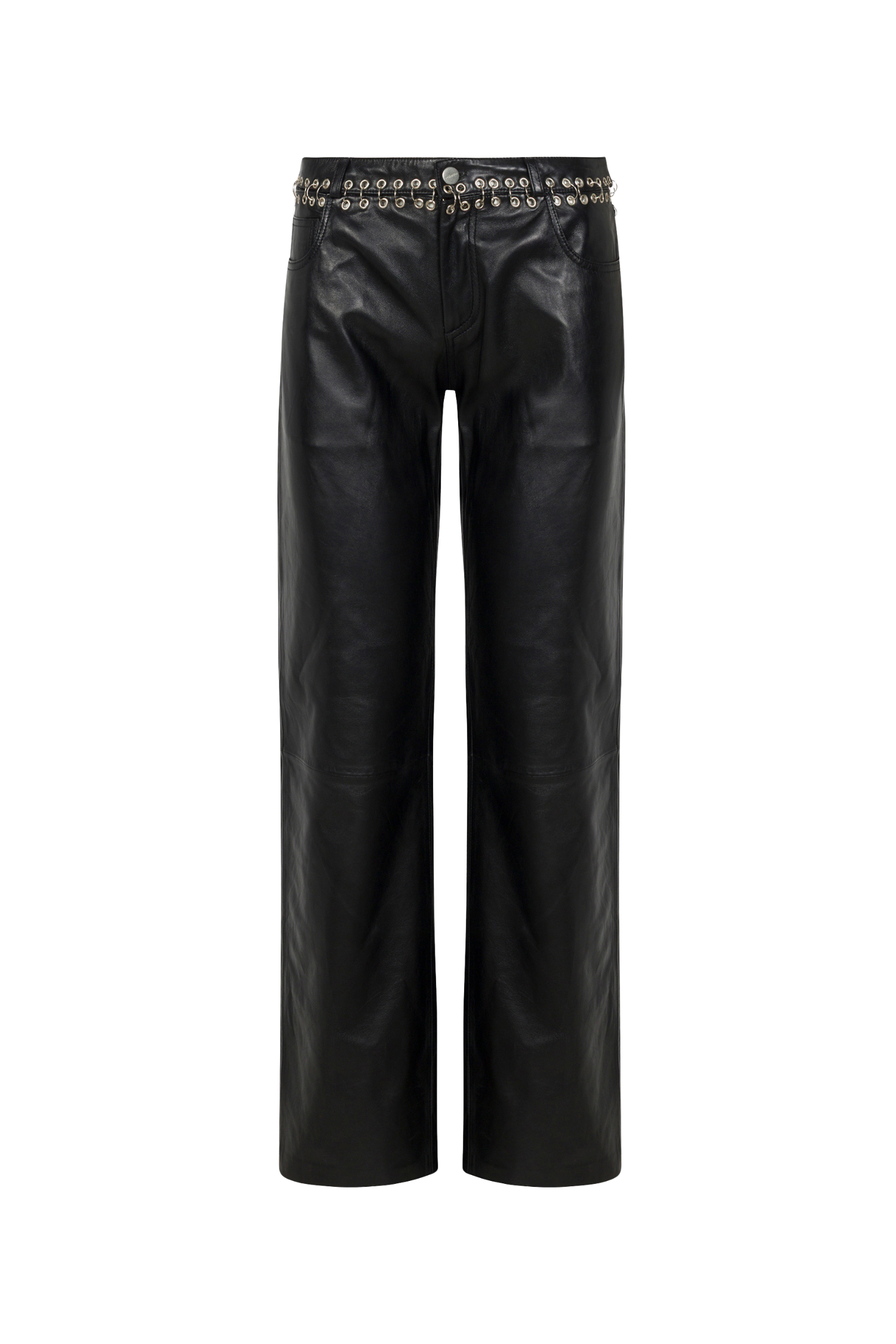 Preorder. ships in mid-January. The Josephina Pant is cut low-rise in smooth lamb leather. Finished with pierced detailing and a classic five-pocket design. she’s sleek. edgy. and made to move with you.