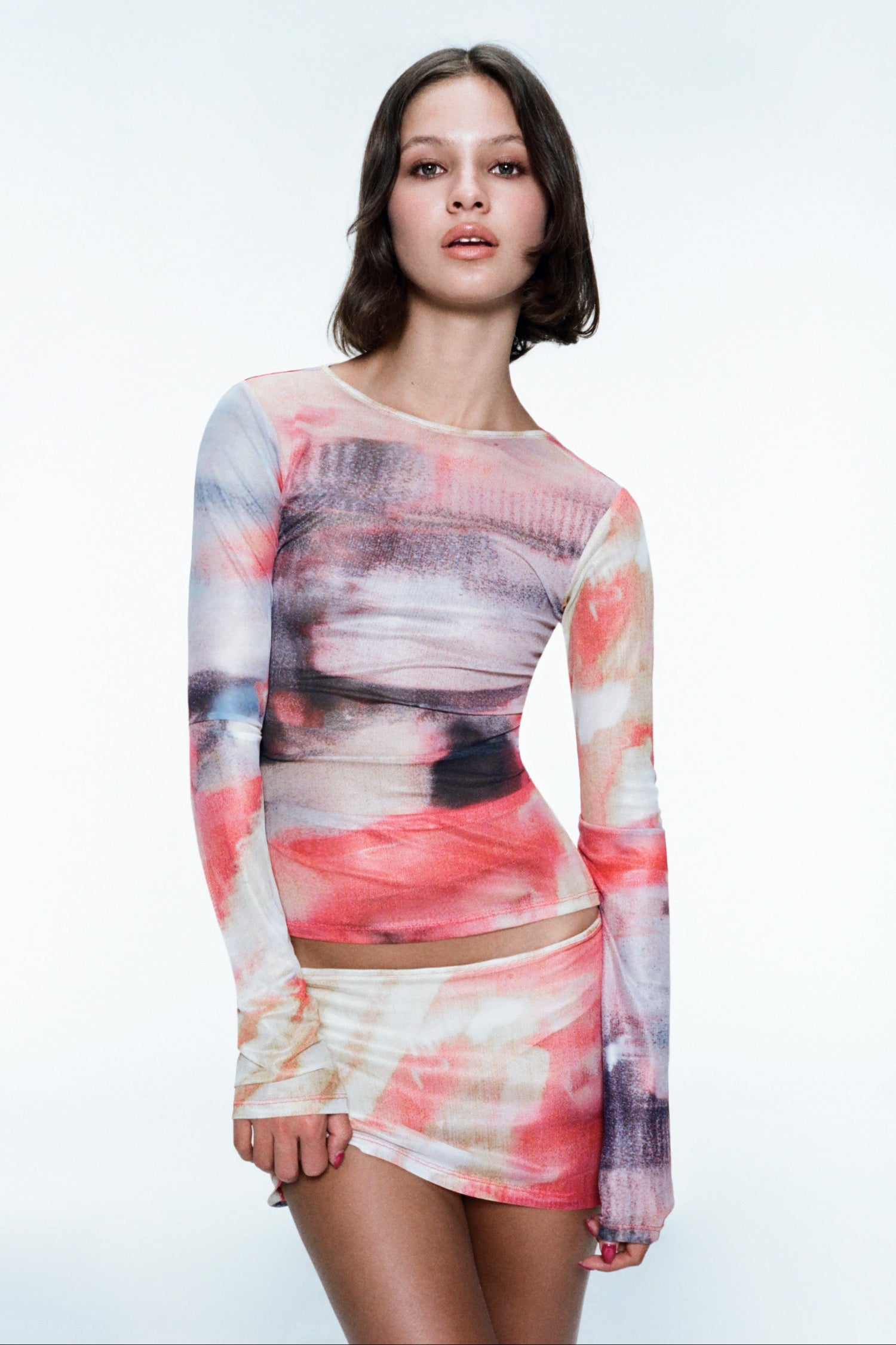 Our bestselling Long Sleeve Tee is back in sculpting mesh. Featuring perfect long sleeves. a new blurred flare print. and ultra soft fabric – it’s no wonder she’s always sold out. Slip her on with the matching Elektra Skirt or the tan Element Pant.
